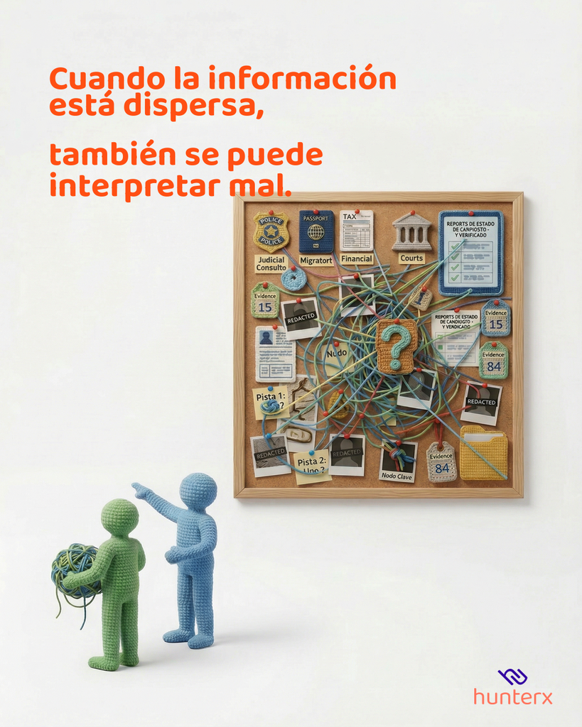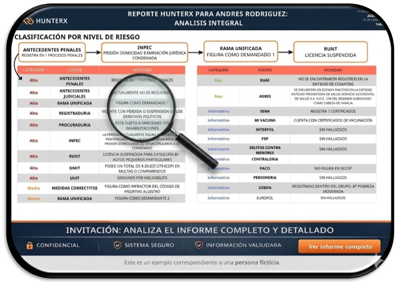 HunterX centraliza información, analiza riesgo y entrega reportes claros para que empresas y equipos tomen decisiones rápidas y defendibles, sin depender de procesos manuales o terceros.